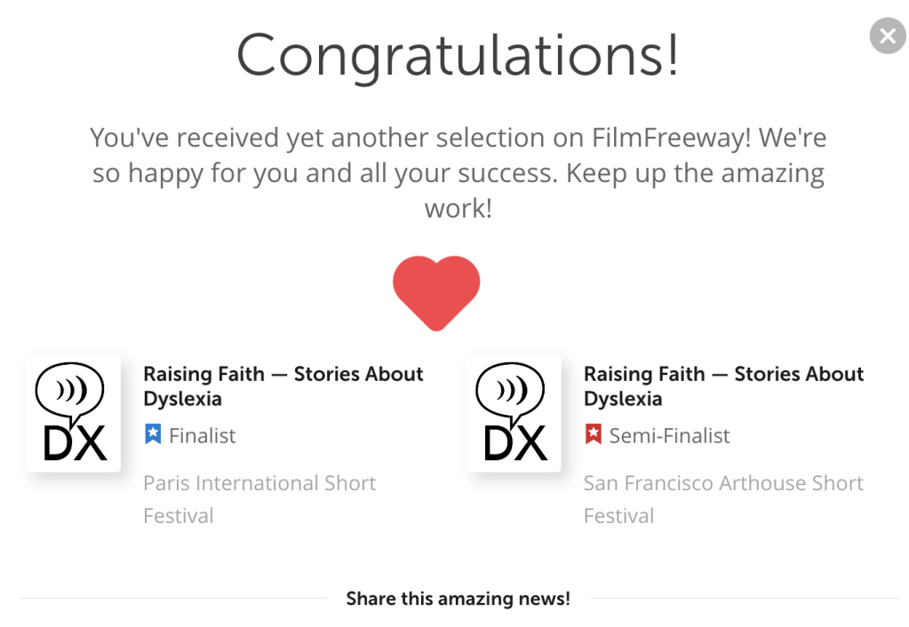 This is our 4th finalist award. We are pleased to be in the top tier and sharing more about dyslexia awareness with the world. Winning films will be announced in early August. An IMDB qualified festival, Paris International Short Festival jury selects the winners of each category through private screenings. The winners of each edition then are considered for the online screening. If this happens, they will be shown online and compete with other films-winners at the online event.